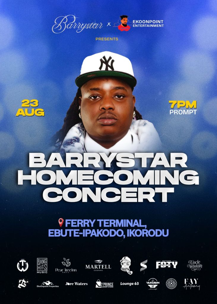 Barrystar and Eko On Point Entertainment are set to host the highly anticipated Barrystar Homecoming Concert on August 23rd, 7 pm at the Ferry Terminal, Ebute-Ipakodo, Ikorodu. The event promises to be an unforgettable night of music and entertainment, featuring the melodious songs of Barryjay.