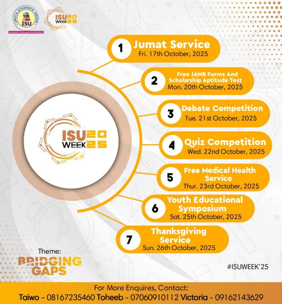 Activities scheduled for ISU WEEK 25 include: Jumat Service, Free JAMB Registration, Debate Competition, Quiz Competition, Free Health Service, Youth Educational Symposium, and a Thanksgiving Service. The official logo and theme for the event were unveiled earlier on August 13 and August 16, 2025, respectively.