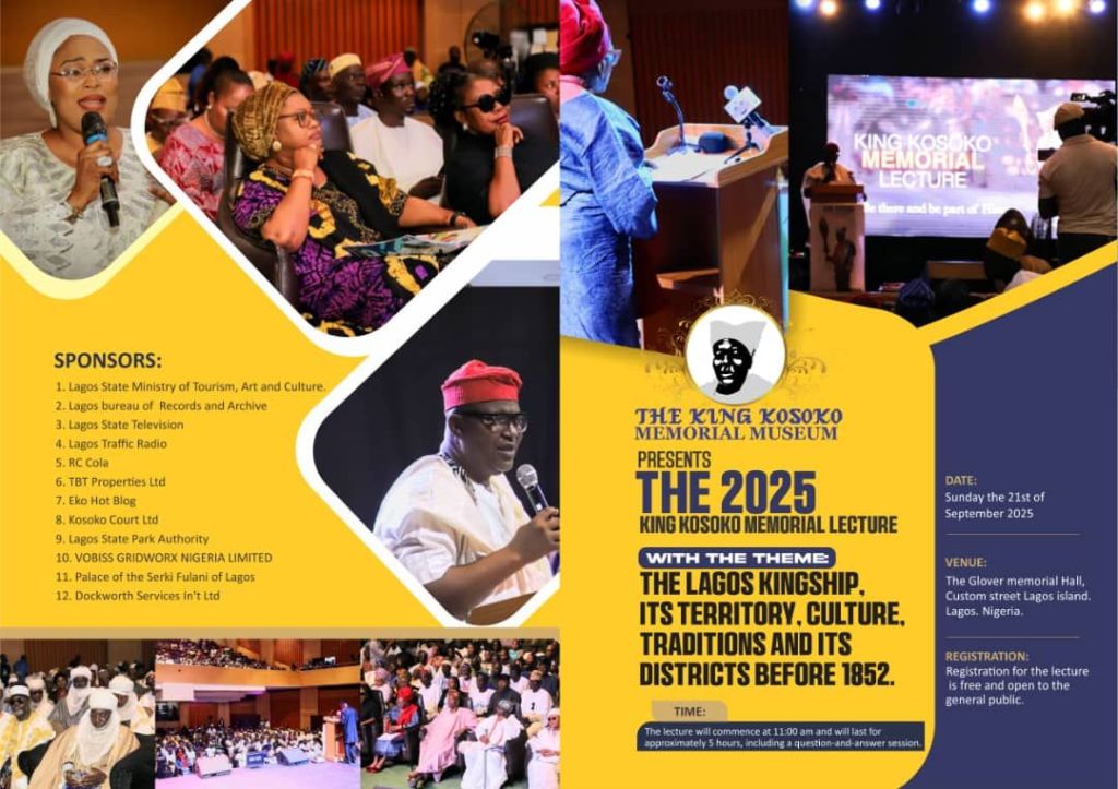 The King Kosoko Memorial Lecture Committee has announced the 2025 edition of the prestigious event, themed “The Lagos Kingship, Its Territory, Culture, Traditions and Its Districts Before 1852.” Scheduled to hold on September 21, 2025, at The Glover Memorial Hall, Custom Street, Lagos Island, the lecture promises to be an enlightening experience for history enthusiasts and scholars alike.
