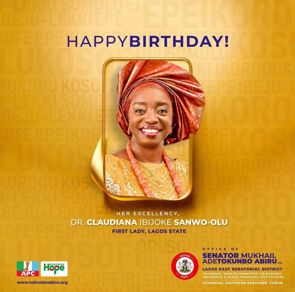 Senator Tokunbo Abiru has extended warm felicitations to the First Lady of Lagos State, Her Excellency Dr. (Mrs) Claudiana Ibijoke Sanwo-Olu, as she marks her 59th birthday.