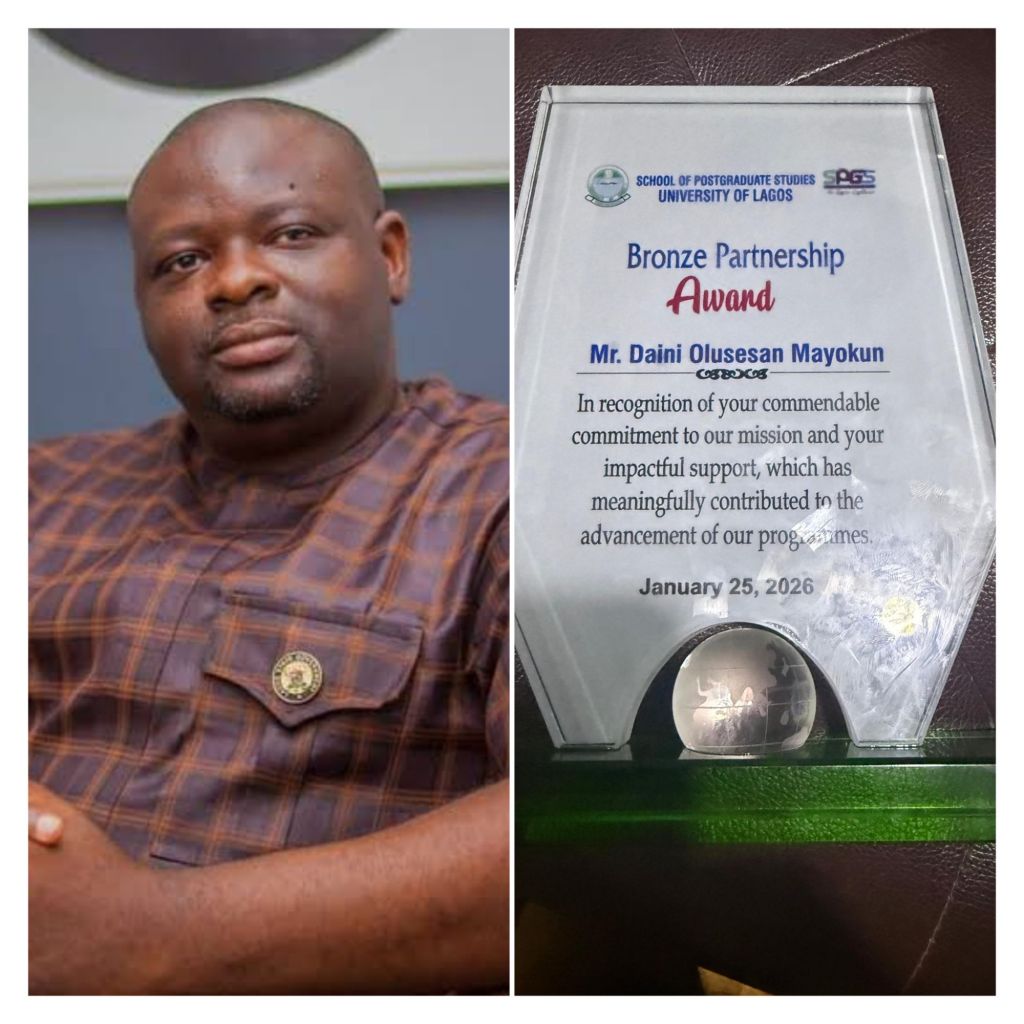 The School of Postgraduate Studies (SPGS), University of Lagos, has conferred a Bronze Partnership Award on Mr. Daini Olusesan Mayokun in recognition of his outstanding commitment and impactful support toward the advancement of the institution’s postgraduate programmes.