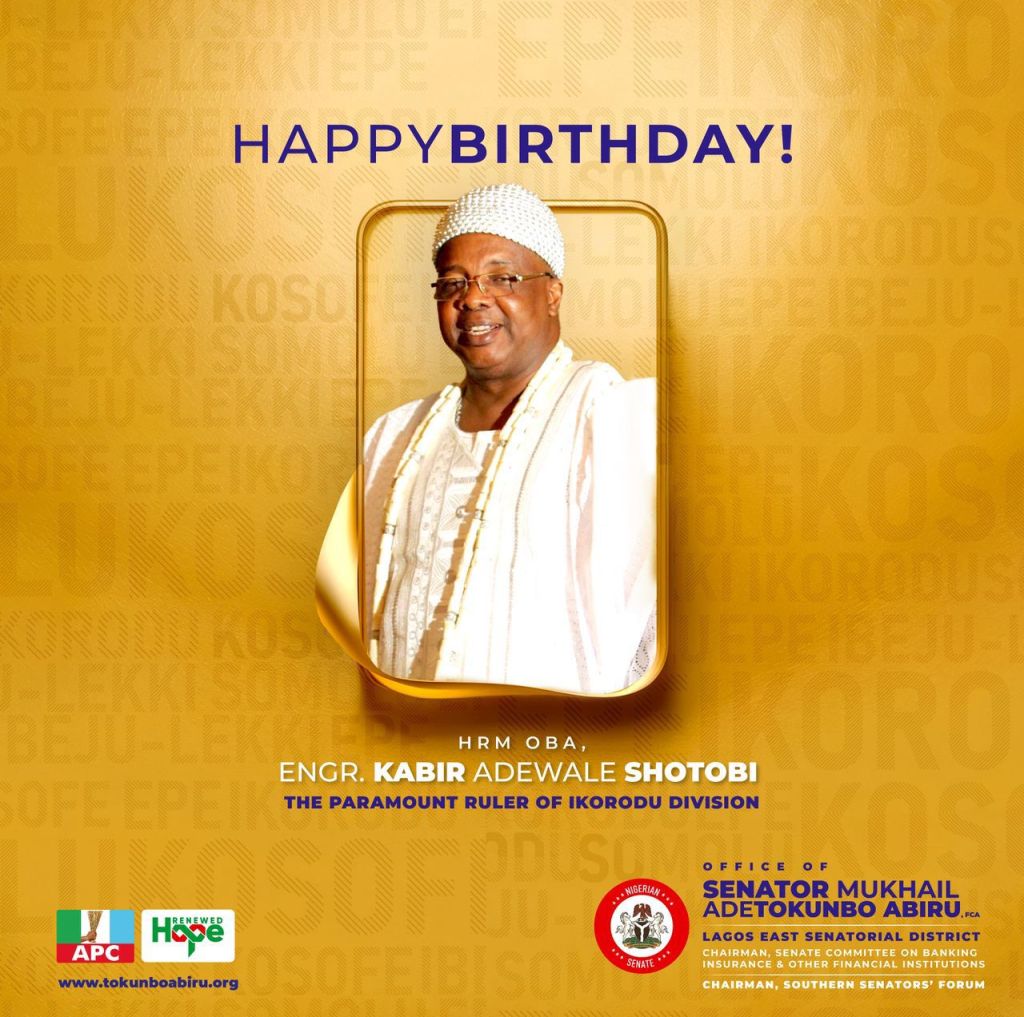 Senator Mukhail Adetokunbo Abiru, representing Lagos East Senatorial District, has extended warm felicitations to the Ayangbure of Ikorodu, His Royal Majesty, Oba (Engr.) Kabir Adewale Shotobi, Adegorushen V, on the occasion of his birthday.