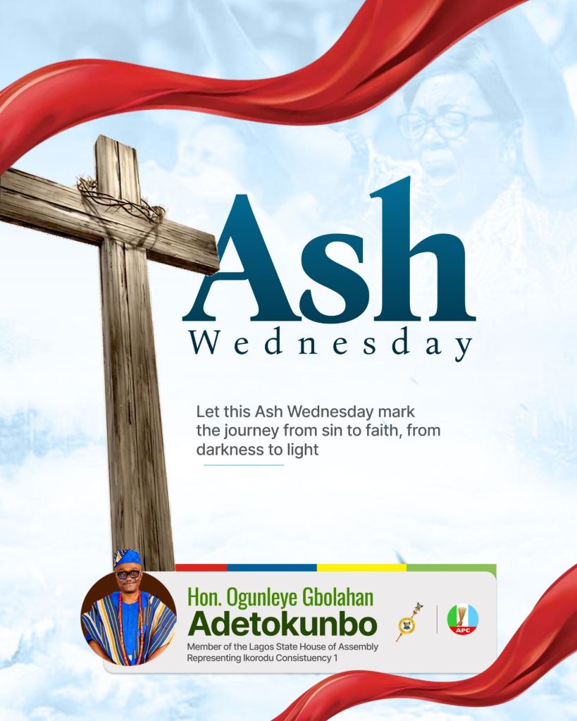 Hon. Ogunleye Gbolahan Adetokunbo, Member Lagos State House of Assembly representing Ikorodu Constituency I, has extended warm felicitations to Christian faithful on the observance of Ash Wednesday, marking the commencement of the Lenten season.