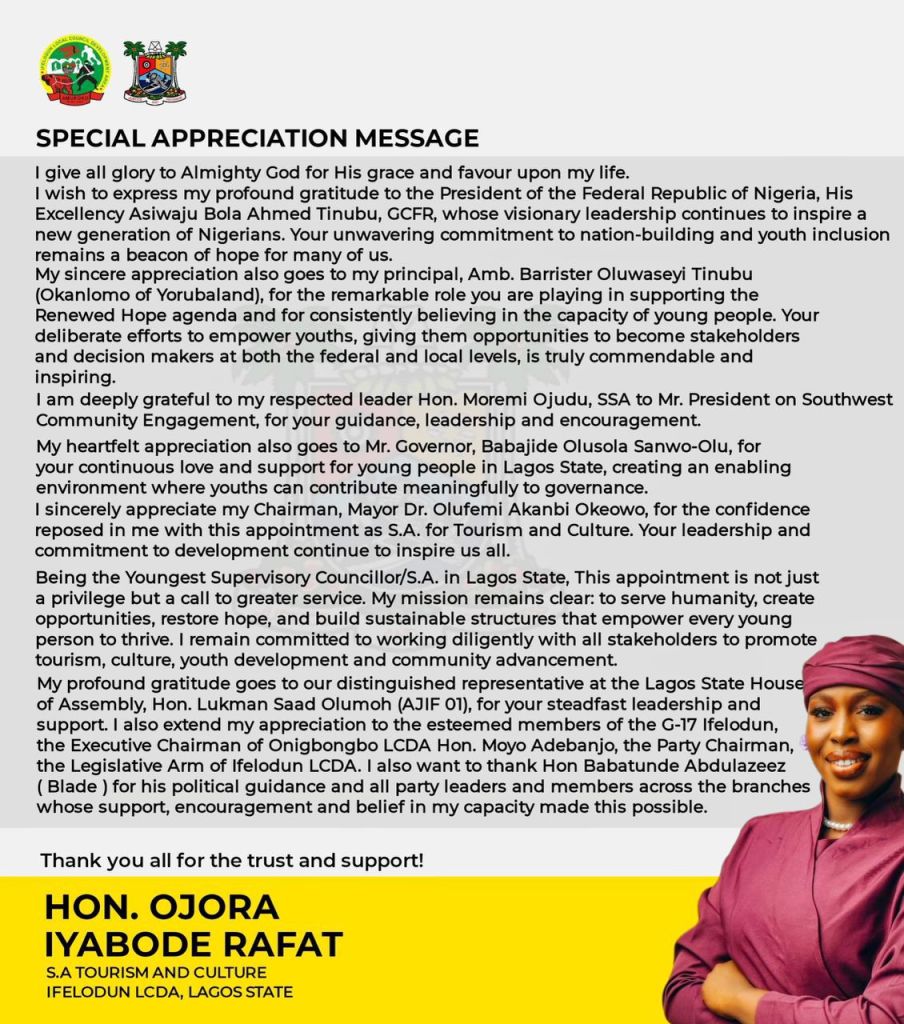 Hon. Ojora Iyabode Rafat, the youngest Special Adviser in Lagos State, has expressed profound appreciation to President Asiwaju Bola Ahmed Tinubu, Lagos State Governor Babajide Olusola Sanwo-Olu, and other political leaders following her appointment as Special Adviser on Tourism and Culture in Ifelodun Local Council Development Area (LCDA), Lagos State.