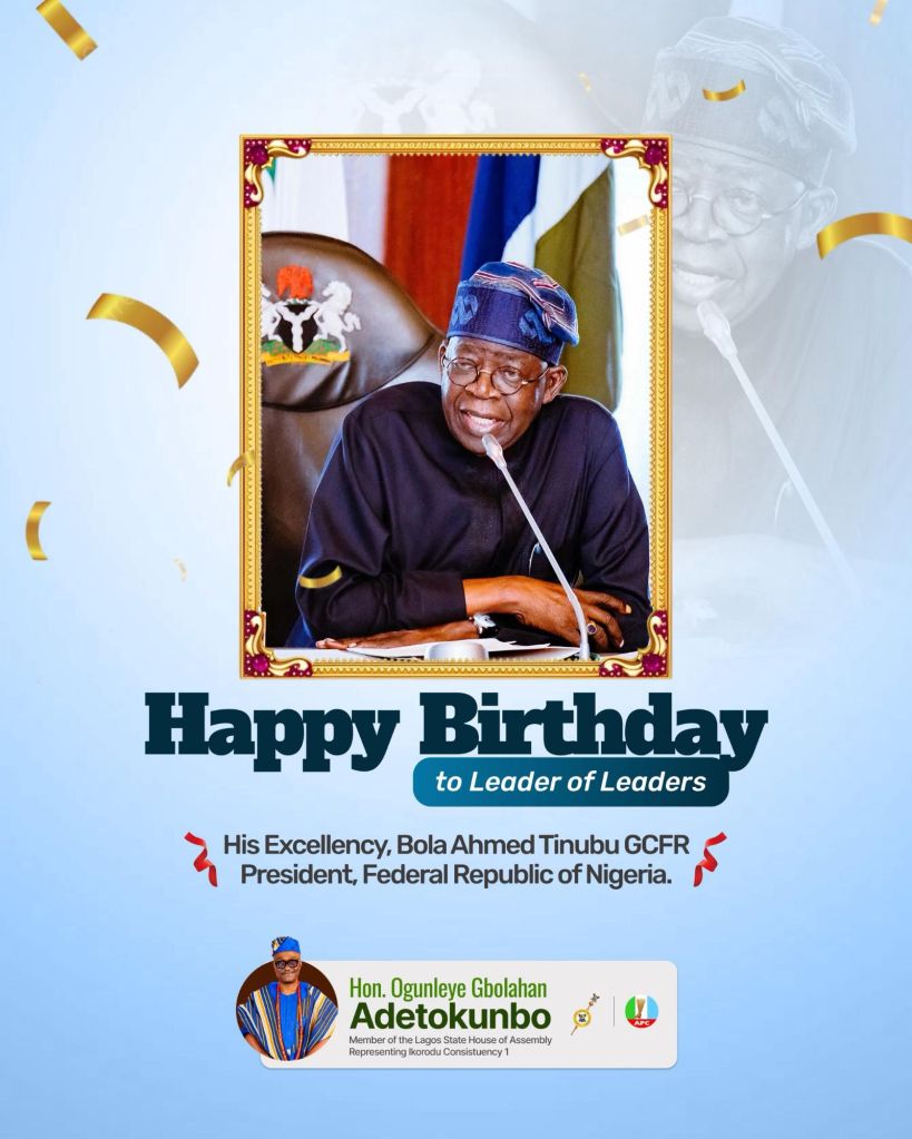 Hon. Ogunleye Gbolahan Adetokunbo, Member of the Lagos State House of Assembly representing Ikorodu Constituency I, has extended warm felicitations to President Bola Ahmed Tinubu on the occasion of his birthday, describing him as a “leader of leaders” whose vision and commitment continue to shape Nigeria’s progress.