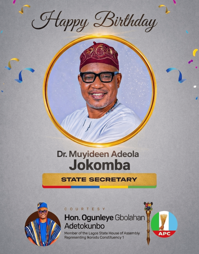 Hon. Ogunleye Gbolahan Adetokunbo, the Member representing Ikorodu Constituency 1 at the Lagos State House of Assembly, has extended heartfelt congratulations to Dr. Muyideen Adeola Jokomba State Secretary of the All Progressives Congress (APC) in Lagos State on the occasion of his birthday.